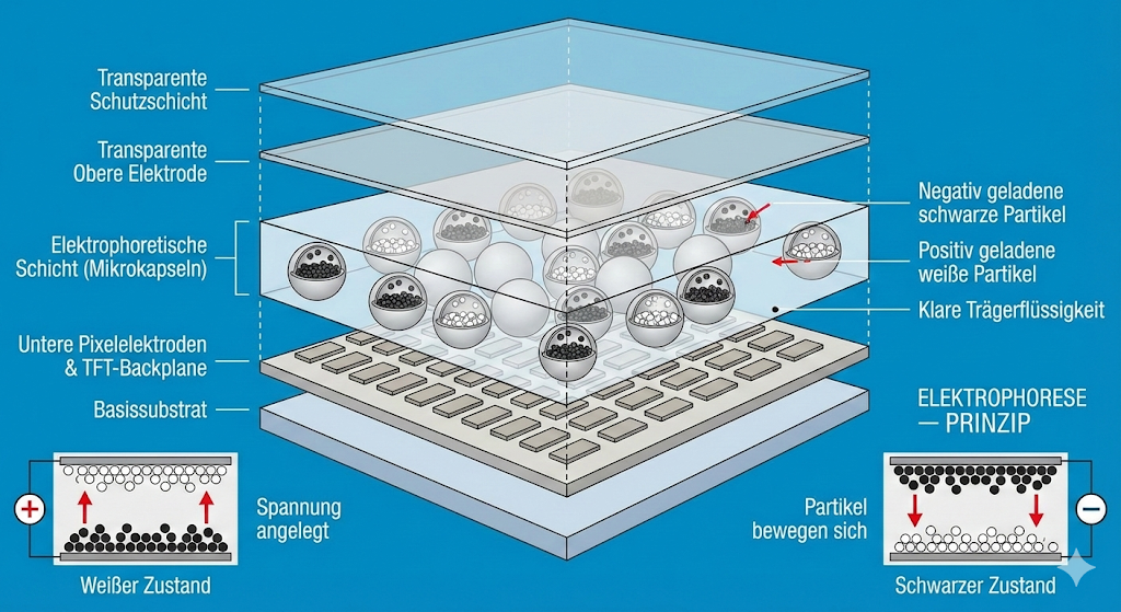 Legt man nun ein elektrisches Feld an, wandern die Teilchen je nach Ladung nach oben (sichtbar) oder nach unten (unsichtbar). Das Geniale: Einmal oben angekommen, bleiben sie dort auch ohne Strom haften. Deshalb verbraucht ein E-Paper nur Energie, wenn sich das Bild ändert – es ist bistabil.