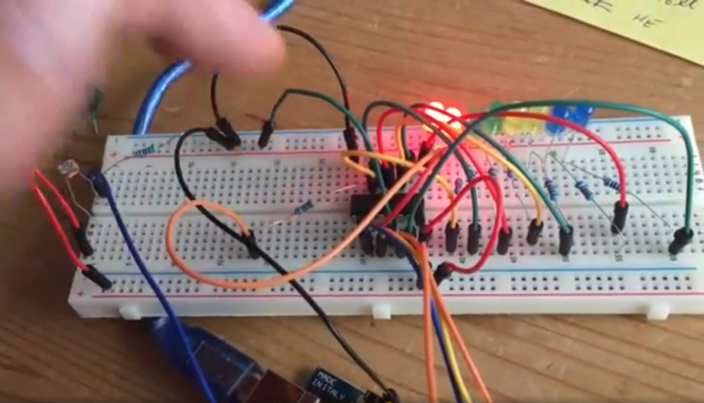 Mit Elegoo Mega R3 und einem Fotowiderstand steuern, wie viele LEDs leuchten, so wie eine Art Helligkeitsanzeige. Auch im Seriellen Plotter zu sehen.